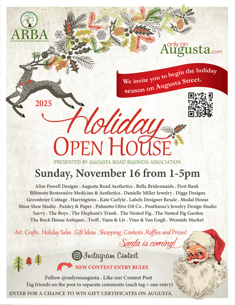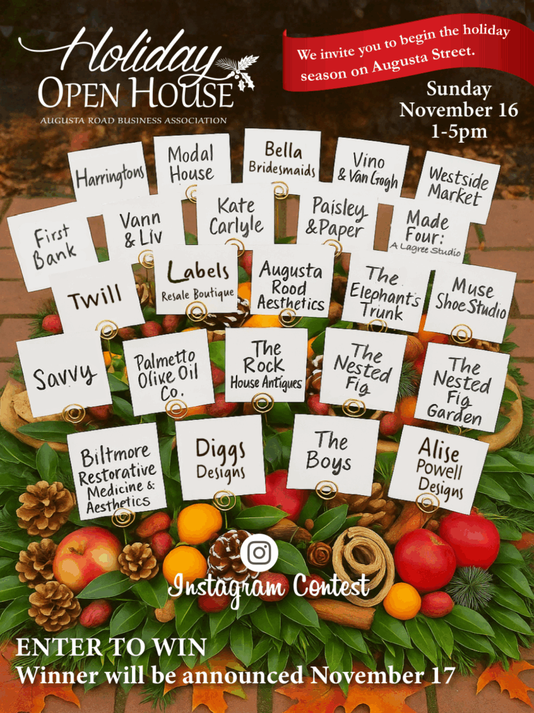 The Annual INSTAGRAM CONTEST returns! Visit this CONTEST LINK . Win a SHOPPING SPREE of gift cards from businesses along Augusta Street. HOW TO ENTER: 1. Follow @Onlyonaugusta.com 2. Like the Holiday Open House Instagram Contest post 3. Tag friends in separate comments (each tag = one entry). The contest starts as soon as the post is released and ends Sunday, November 16 by 5:00 p.m. We will announce the lucky winner on Monday, November 17.